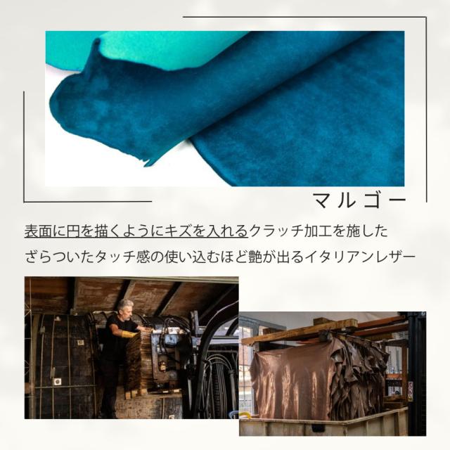 ■バケッタ製法の植物タンニン鞣しで染料仕上げをし、表面に円を描くようにキズを入れるスクラッチ加工を施したマルゴーといわれる牛革を使用しています。ざらついたタッチ感でマットな表情ですが、使うほどに艶が出て経年変化が楽しめます。