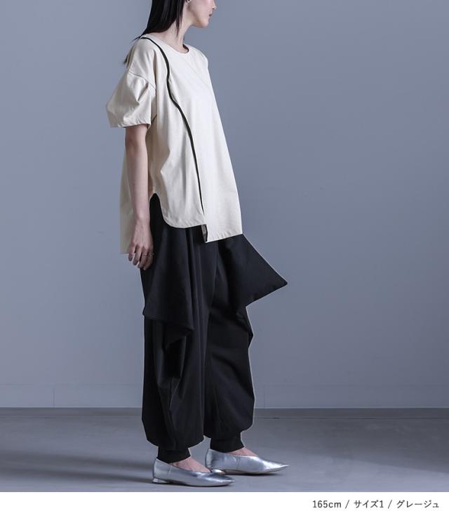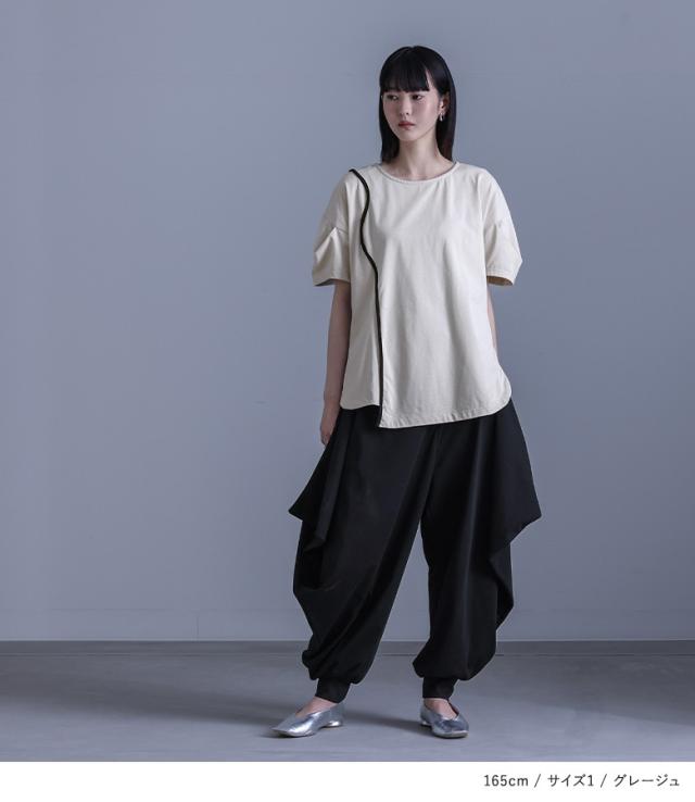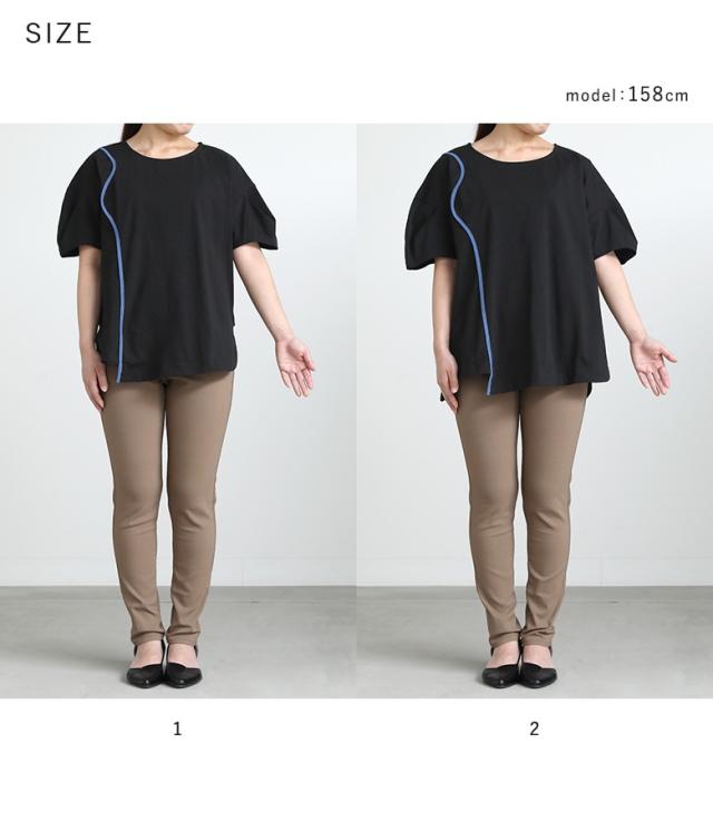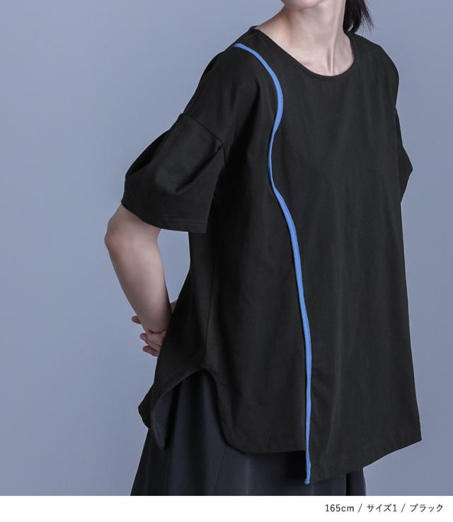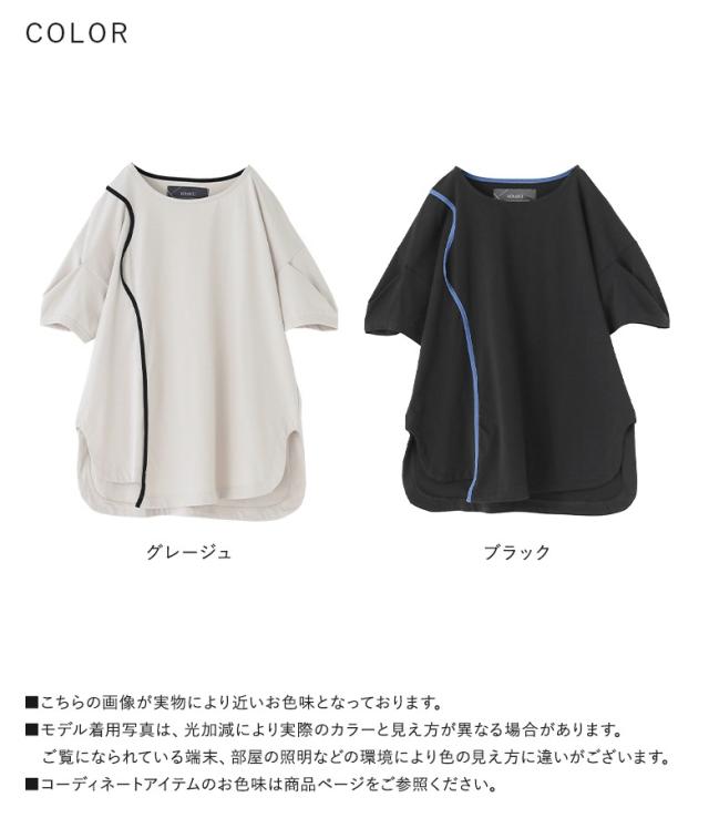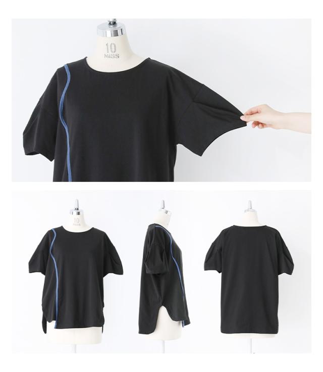 『袖変形配色カーブラインカットソー』※メール便可※【10】[カットソー レディース トップス 半袖 Tシャツ 綿100% クルーネック 配色 カーブライン 袖タック デザインT 春 夏]