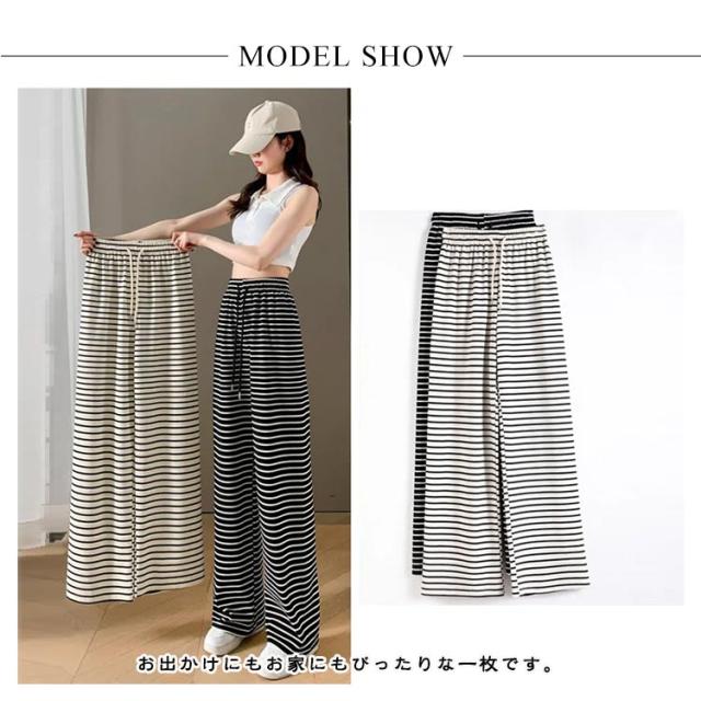 レディース ワイドパンツ ストレートパンツ ボーダー 柄パンツ ロングパンツ ルームウエア 部屋着 ルームパンツ 10分丈 カジュアルパンツ イージーパンツ ウエストゴム 楽ちん ボトムス カジュアル おしゃれ 春 夏 送料無料