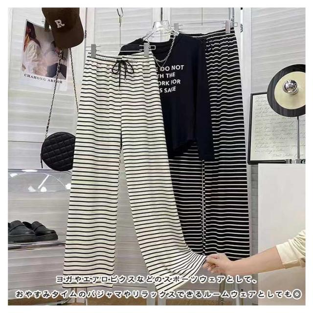 | 穿きやすいボーダー柄ワイドパンツ お出かけにもお家にもぴったりな一枚です。 裾に向かってすとんと落ちるきれいなシルエット。 ウエストゴムでストレスフリーなはき心地◎ ヨガやエアロビクスなどのスポーツウェアとして、おやすみタイムのパジャマやリラックスできるルームウェアとしても◎ | |