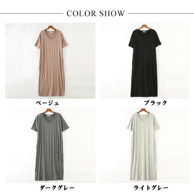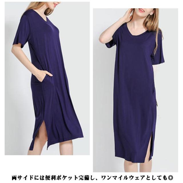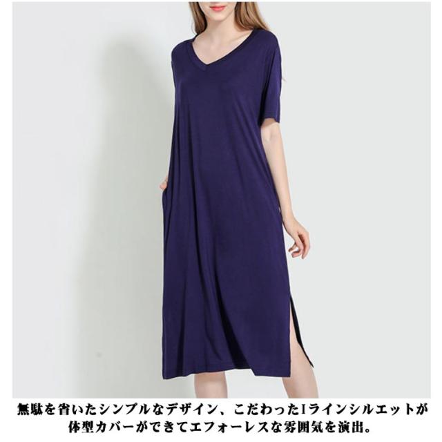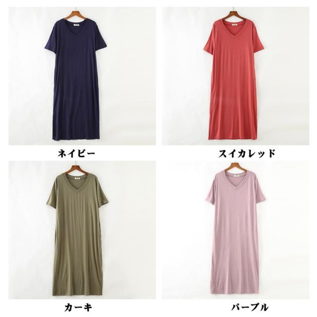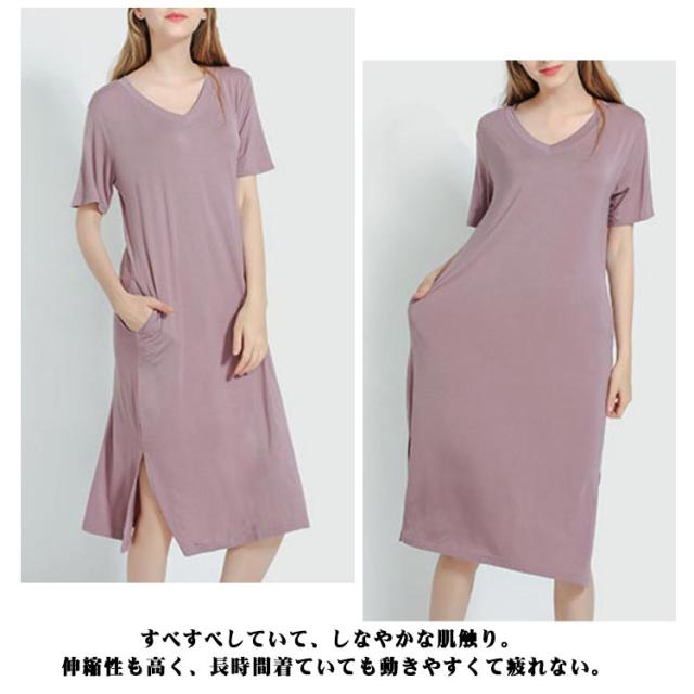 とろみ ストレッチ Tシャツ ワンピース レーヨン ひざ下 Tワンピース Vネック ルームウェア 部屋着 涼感 さらっと ルームワンピース ポケット付き 外出 スリット入り 送料無料