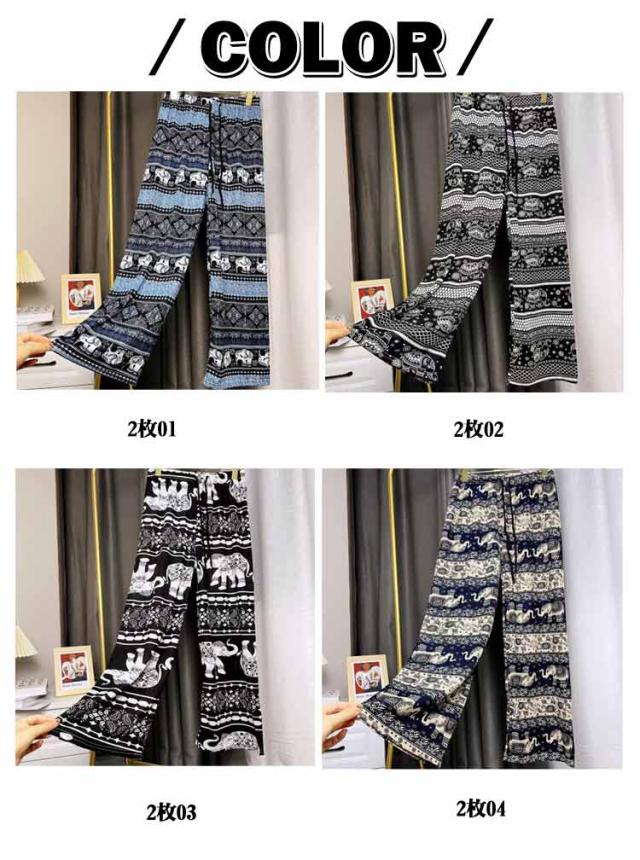 2枚セット ワイドパンツ 総柄 レディース タイパンツ ゾウ柄 冷感 涼感 接触冷感 パンツ ワイド ロング 夏 ルームウェア 部屋着 落ち感 薄手 通気性 体型カバー ハイウエスト ゴムウエスト ストレッチ パンツ カジュアル
