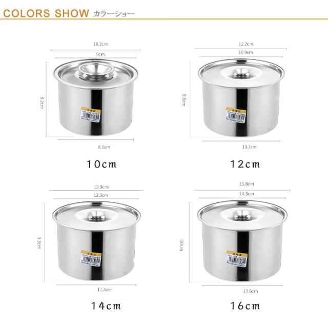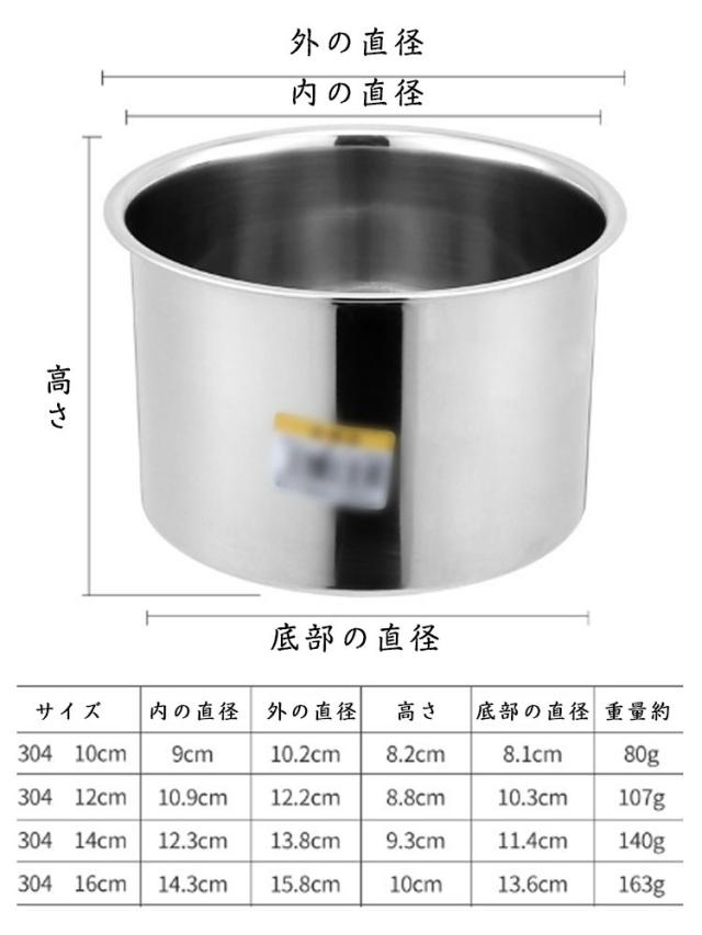| サイズについての説明 | サイズ: 10cm 外の直径10.2cm、内の直径9cm、高さ8.2cm、底部の直径8.1cm、重量約80g。 12cm 外の直径12.2cm、内の直径10.9cm、高さ8.8cm、底部の直径10.3cm、重量約107g。 14cm 外の直径13.8cm、内の直径12.3cm、高さ9.3cm、底部の直径11.4cm、重量約140g。 16cm 外の直径15.8cm、内の直径14.3cm、高さ10cm、底部の直径13.6cm、重量約163g。 ※実寸はメジャー採寸の為、若干の誤差が生じる場合があります。 |