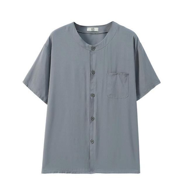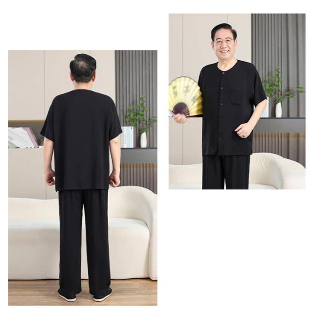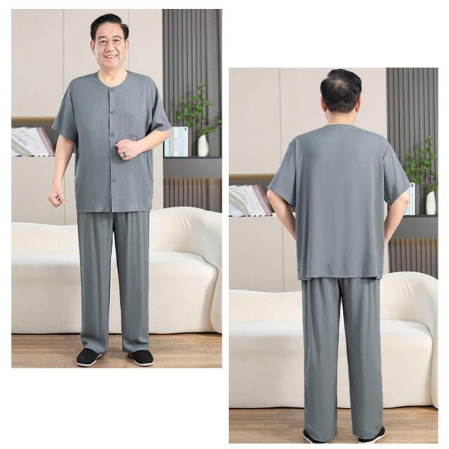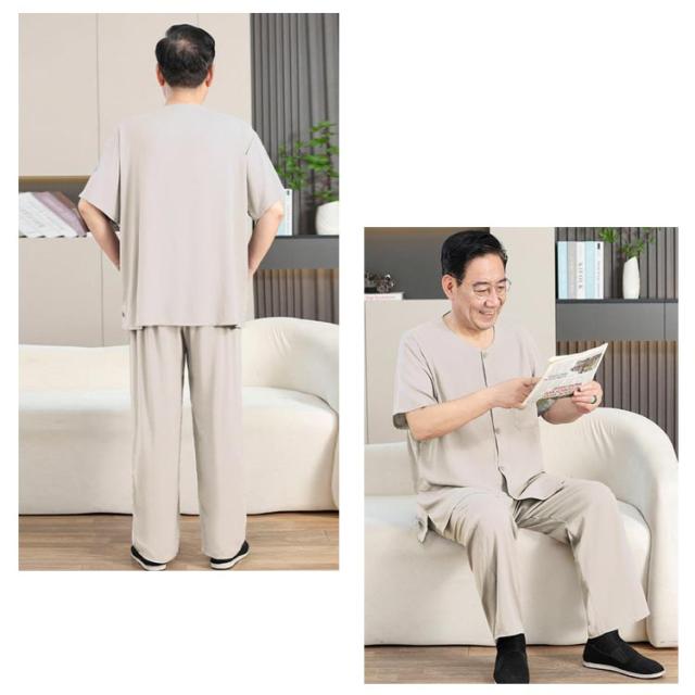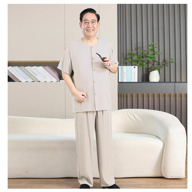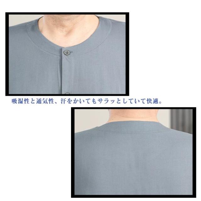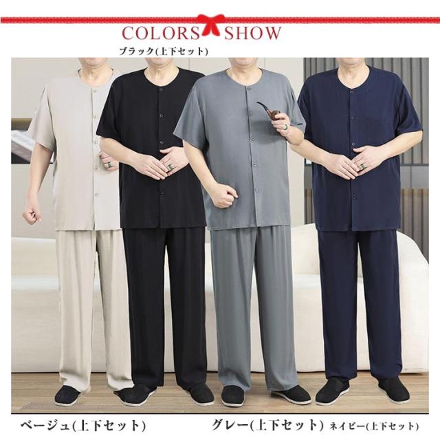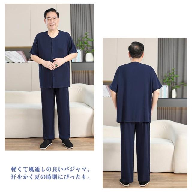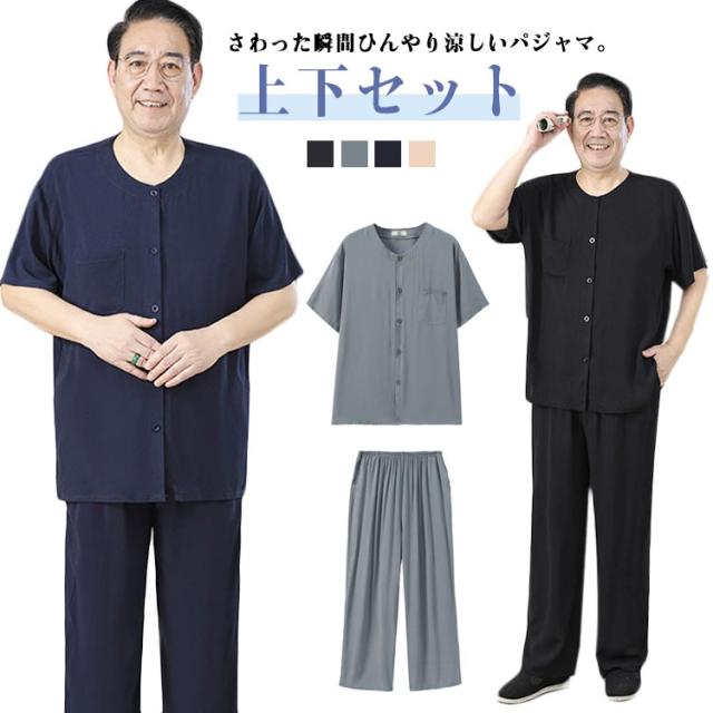送料無料 シニア パジャマ メンズ 半袖 前開きシャツ ロングパンツ 上下セット 入院着 寝間着 部屋着 接触冷感 冷たい 涼しい 甚平 夏 ルームウェア サマー 寝巻き ウェストゴム 襟なし 高齢者 介護