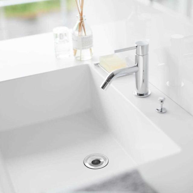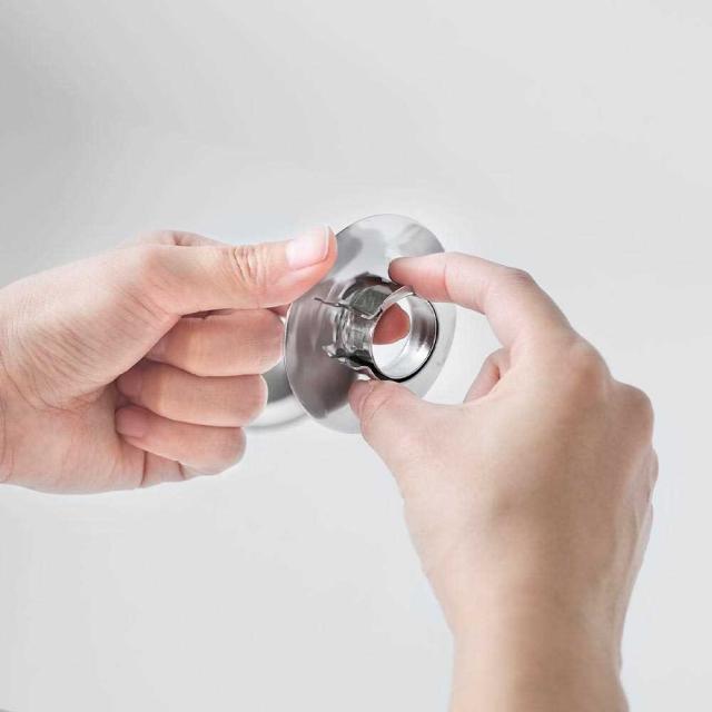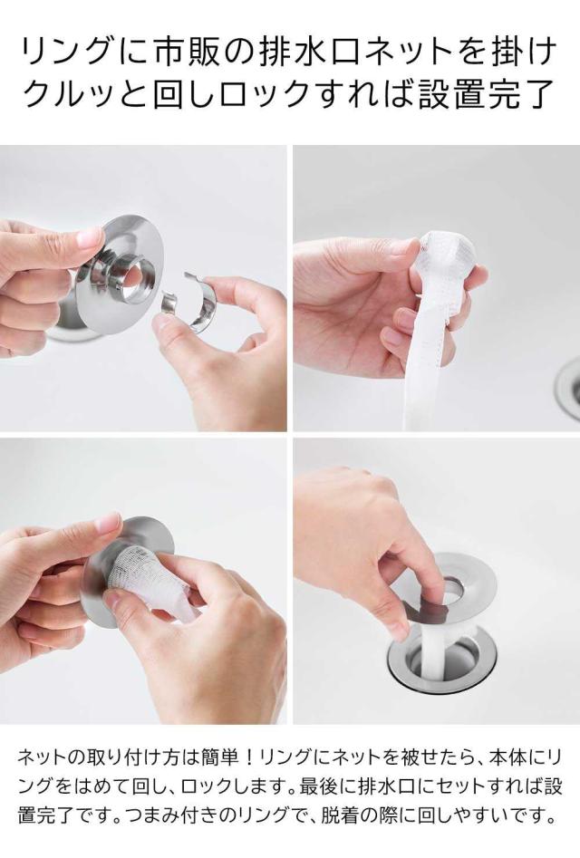 シンプルでお手入れしやすい!簡単に脱着できる排水口ネットホルダー。ステンレスのリングをはめるだけのシンプルな構造。リングを回すとロックがかかり、ネットが外れて落下するのを防ぎます。シンプルな使用方法でネット交換やお手入れも簡単!いつも清潔な洗面台をラクにキープできます。