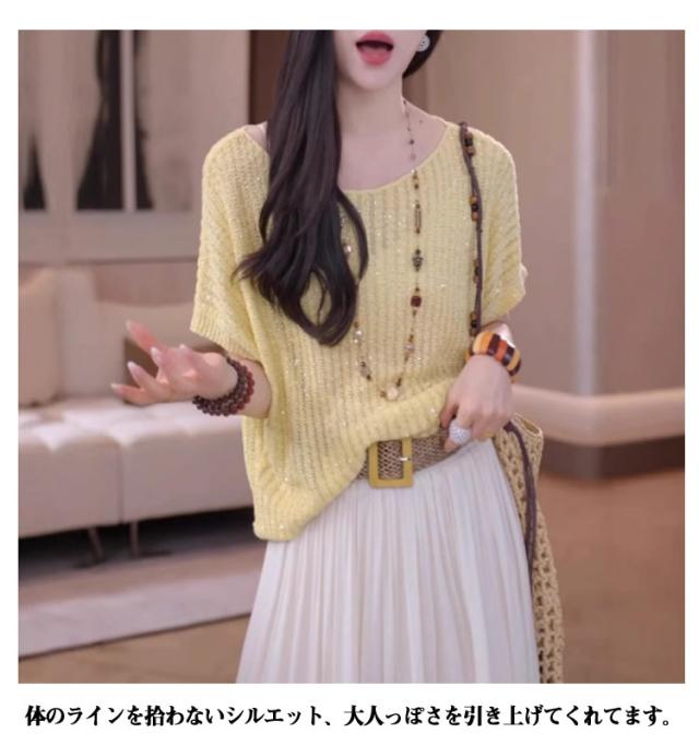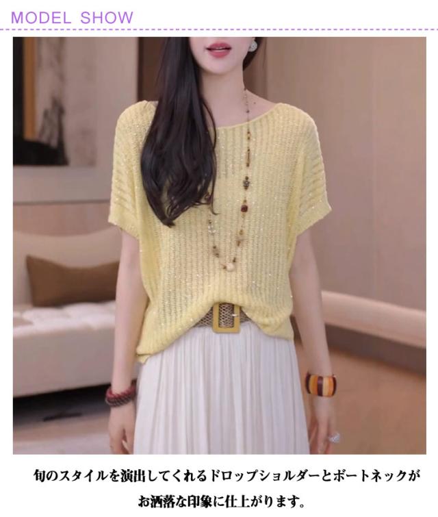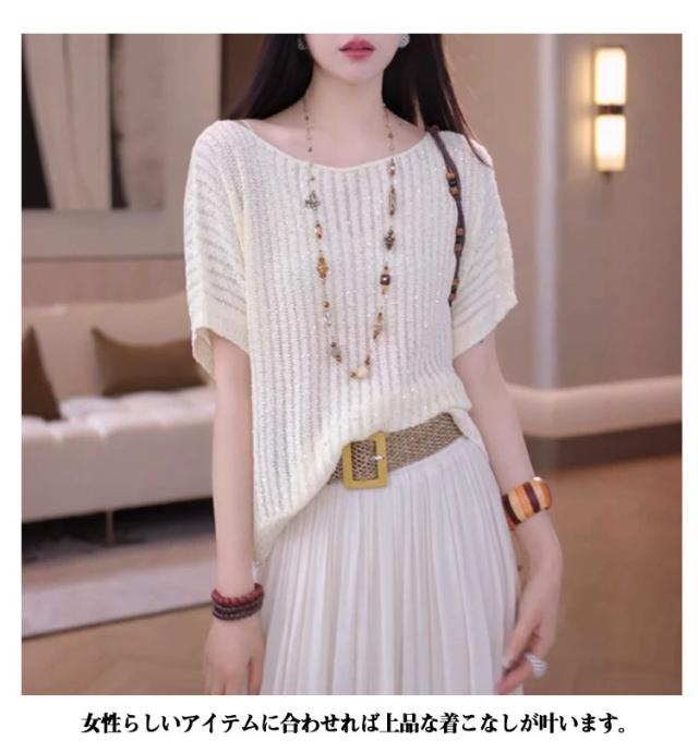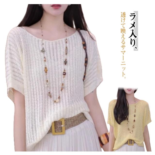 トップス ニットソー 薄手 ラメ入り ニット レディース 夏 春 ニットセーター きれいめ 透かし ニット 半袖ニット サマーニット 半袖 ニットTシャツ カットソー ラメ入り サマーセーター かわいい ゆったり カジュアル