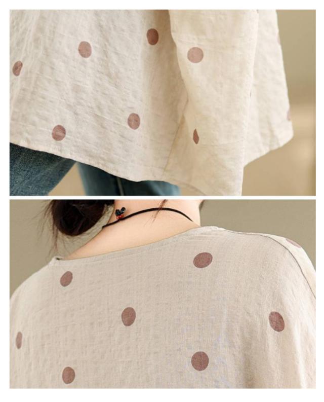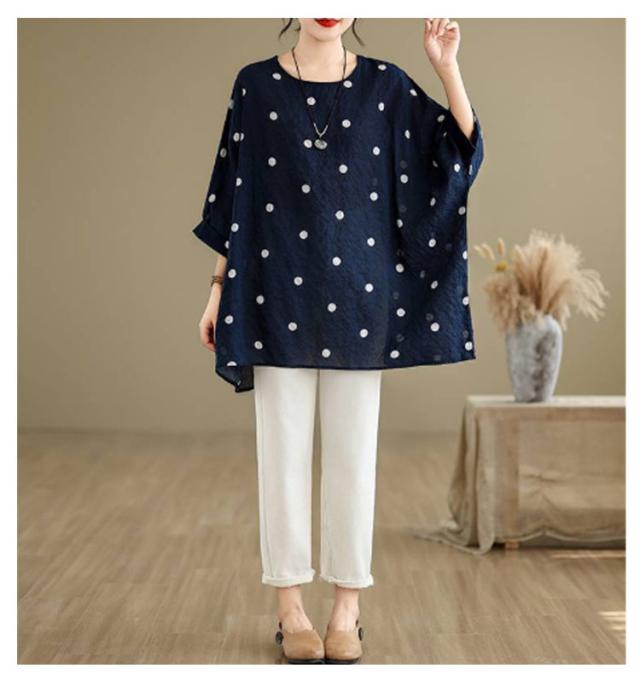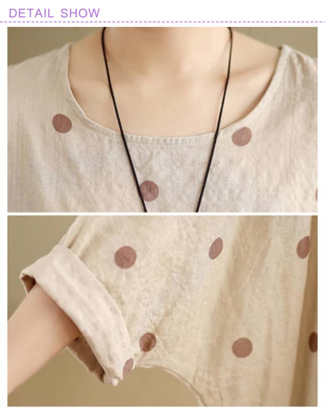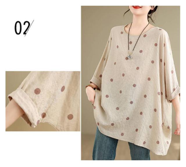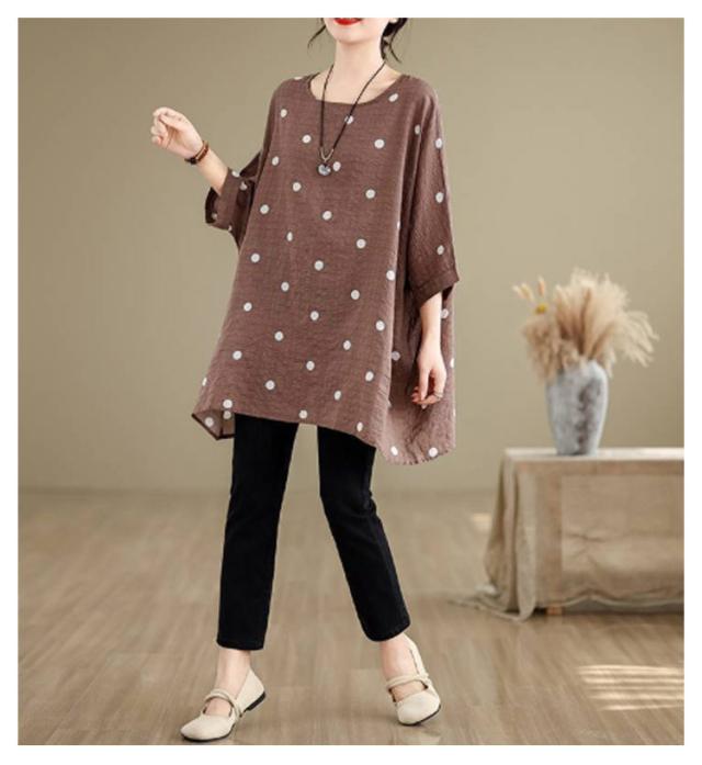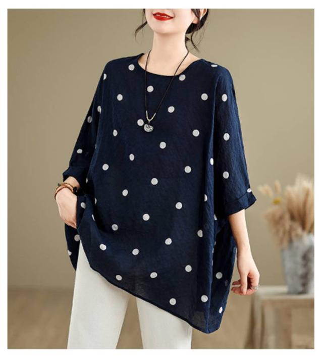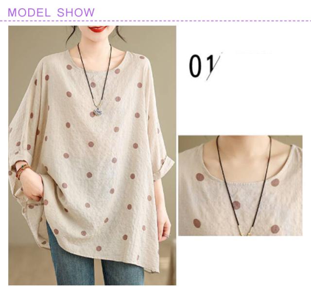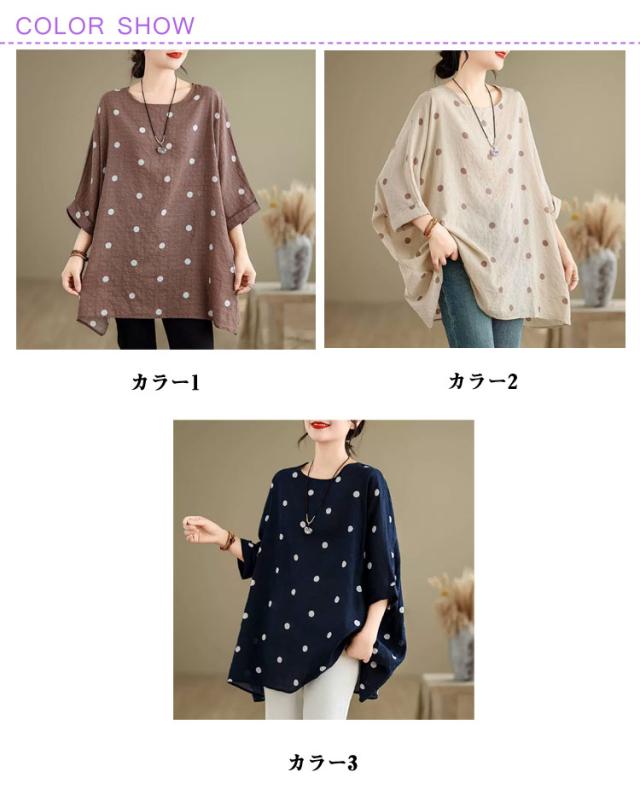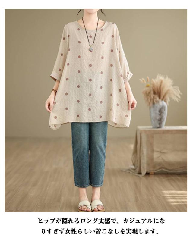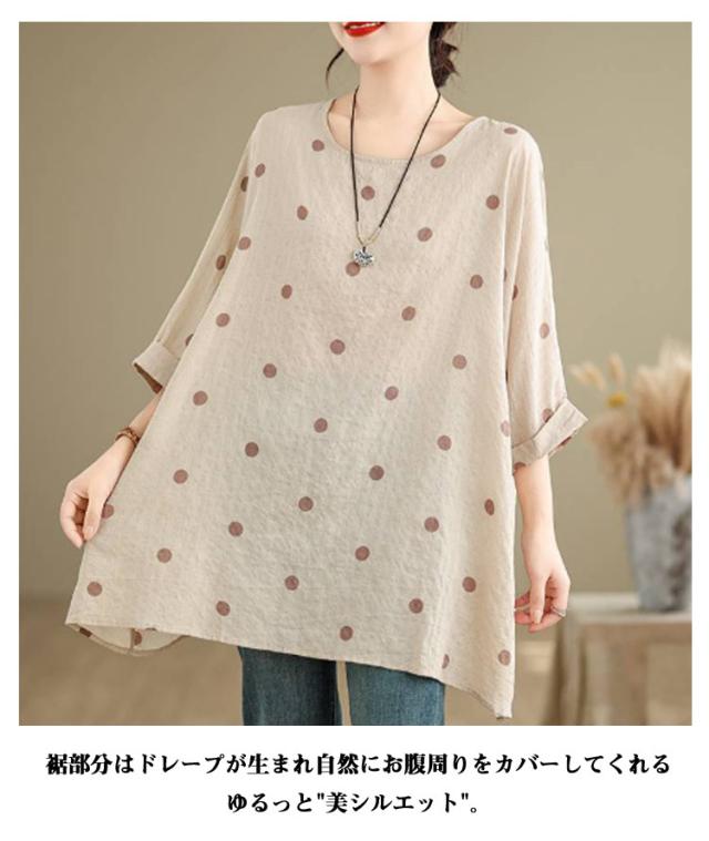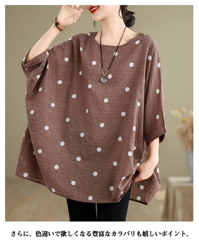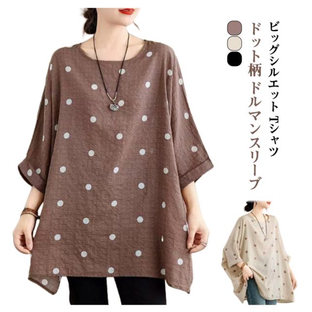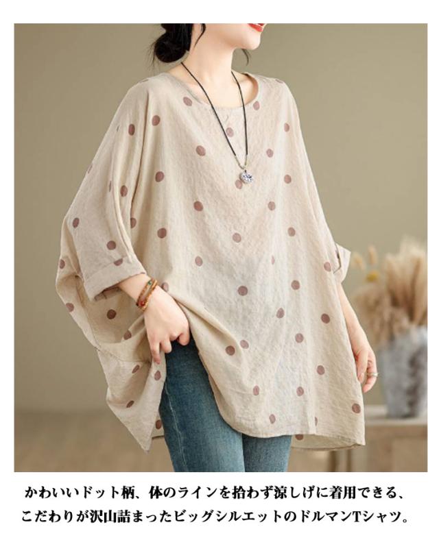 ロングTシャツ ビッグシルエット レディース トップス Tシャツ ドルマンスリーブ ビッグシルエット ドット柄 ティーシャツ ゆったり 二の腕カバー 体型カバー ロング