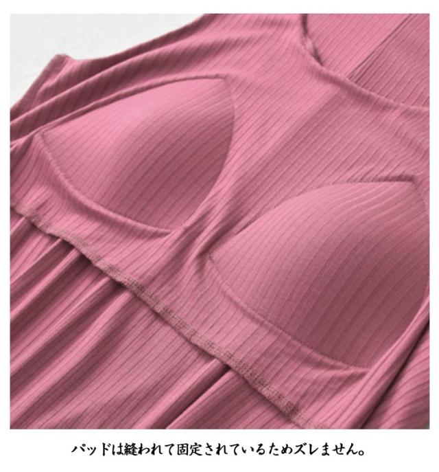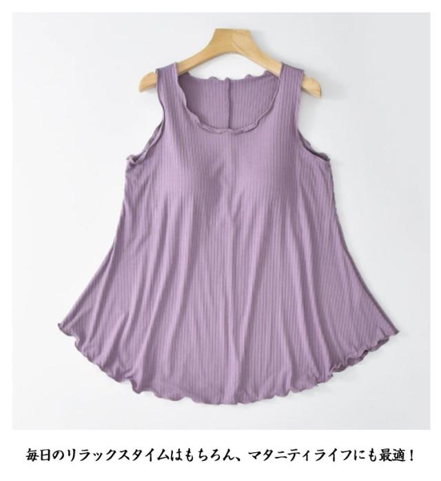 | 【かわいい裾フリルデザイン!】 締め付けない!心地よく一枚で着れるカップ付ノースリーブチュニック 一枚で着ても、インナーとしても、ストレスなく着られるルームウエアです。 パッドは縫われて固定されているためズレません。 ほどよく前面がフィットし、締め付け感なしでリラックスしたい休日などにぴったりです。 アンダーゴムフリーなので汗が溜まらず嫌な締付けもない楽ちんな着心地! 毎日のリラックスタイムはもちろん、マタニティライフにも最適! 一枚でリラックス&美しいシルエットを叶えてくれる! 寝るときのナイトブラ代わりにもおすすめです。 旅行や出張での長時間移動に。 ホテル内や旅館内でのリラックスウェアに。 | |