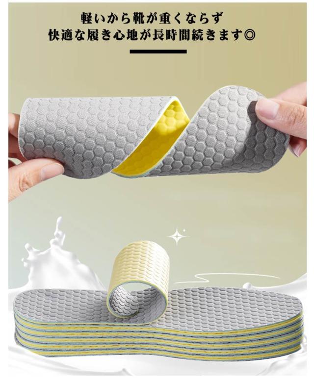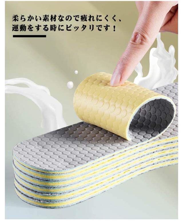 | 臭いや蒸れをサポートする涼風爽快インソール。 土踏まずを支えることで体圧を分散し足の疲れや痛みを軽減します。 軽いから靴が重くならず快適な履き心地が長時間続きます◎ 柔らかい素材なので疲れにくく、運動をする時にピッタリです! ハサミで簡単に切れるのでご自身でサイズを微調整できます。 | |