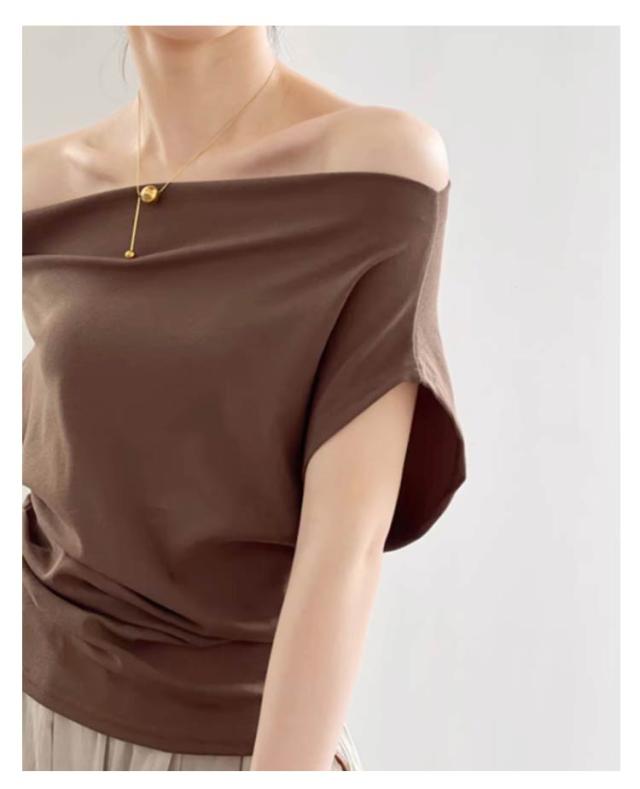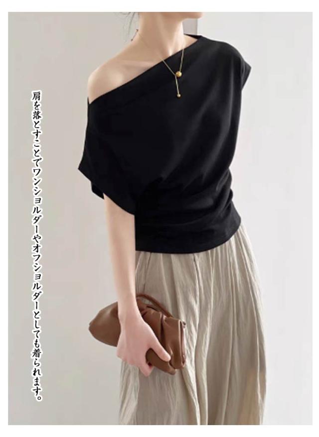 春夏 Tシャツ レディース 肩出し ワンショルダー トップス オフショルダー オフショル ワンショル Tシャツ Tシャツ 夏 デコルテ 鎖骨 カジュアル おしゃれ ワンショルダー 夏 ギャザー 韓国