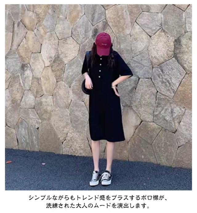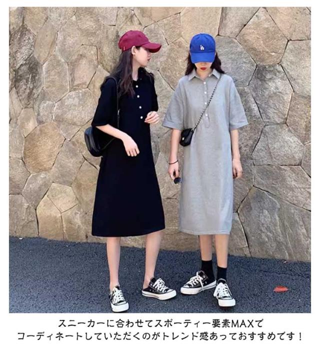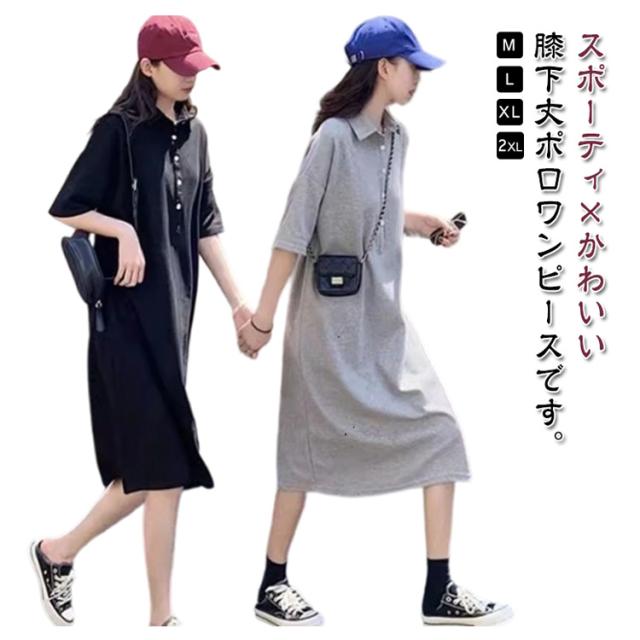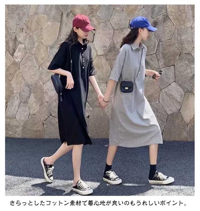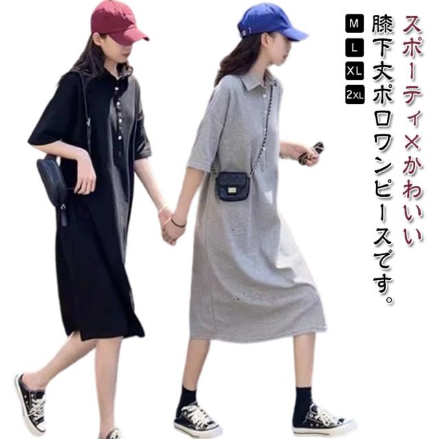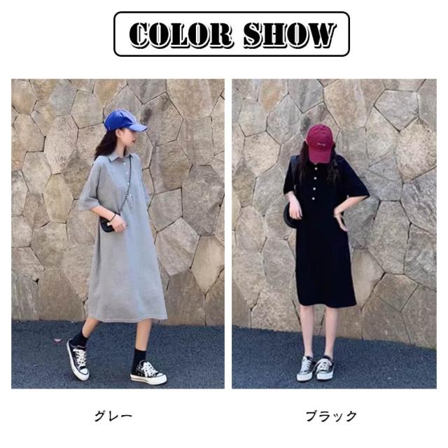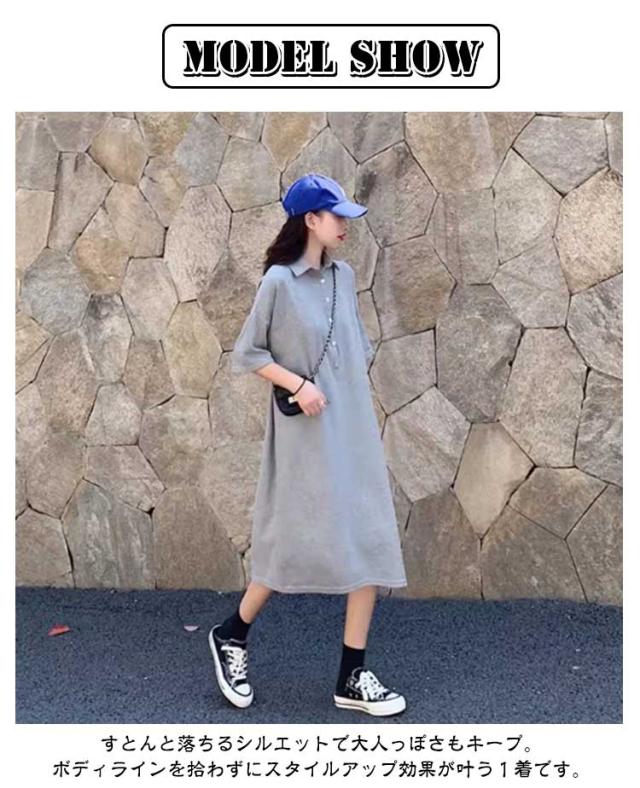半袖 体型カバー ワンピース ゆったり ゴルフ ポロシャツ風 襟付き スポーティー ポロワンピース ワンピ 黒 ストレートワンピース Iライン 大きいサイズ 着?せ 細見え ポロワンピ 膝下丈 韓国風 通勤 オフィス カジュアル グレー ポロワンピース 無地 シンプル