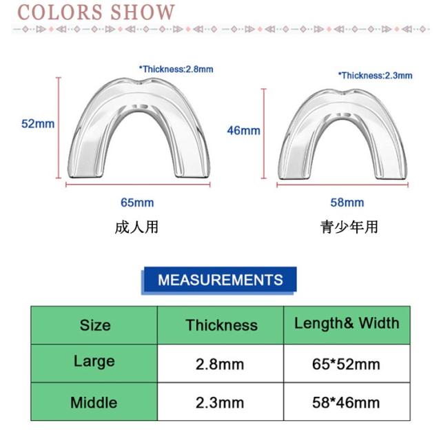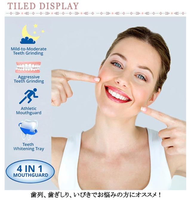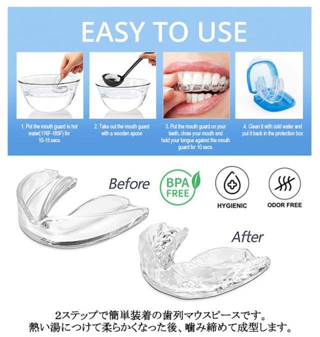 | 1箱(2個入)×2箱!自分専用マウスピース お湯で簡単成型!収納ケース付! 歯列、歯ぎしり、いびきでお悩みの方にオススメ! 2ステップで簡単装着の歯列マウスピースです。 熱い湯につけて柔らかくなった後、噛み締めて成型します。 就寝中に装着しているだけで、いびき・歯ぎしりを抑え、歯列矯正にも効果があります。 自分の歯型にピッタリの型を作れるので、歯に負担がなく使えます。 上下歯間の部分に十分の厚さがあり、歯型が十分に付くので、マウスピースが歯に優しくフィットします。 いびき・歯ぎしりがひどい方、ワイヤー矯正の後にリバウンドしてしまった方、出っ歯・すきっ歯の方等、様々なお悩みに対応します。 | |