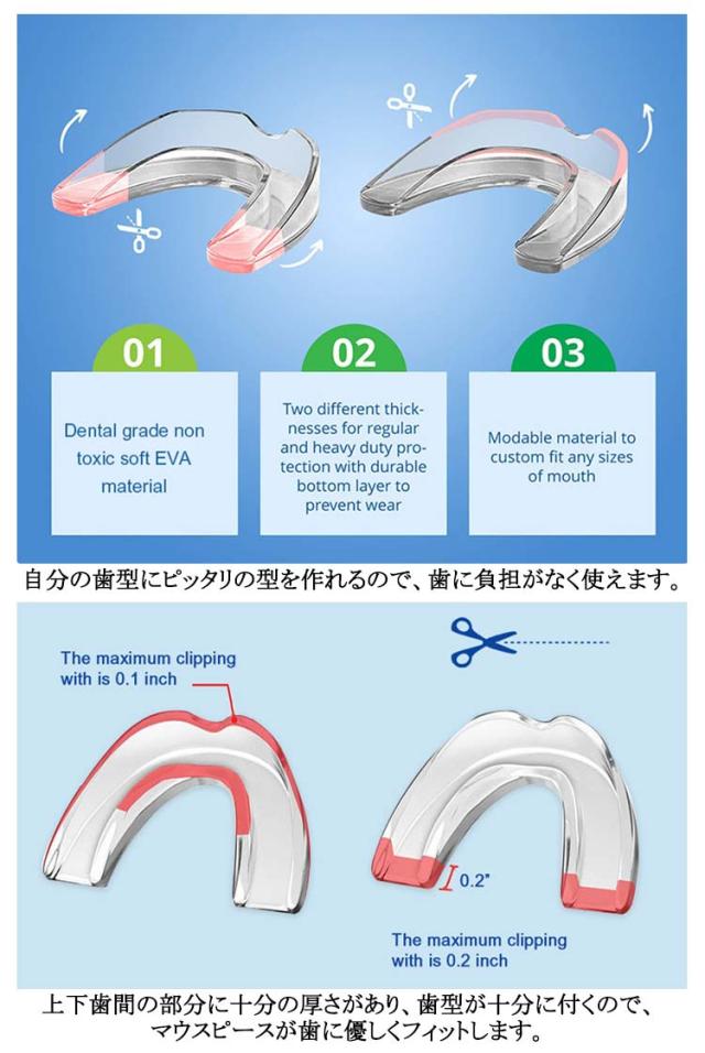 | サイズについての説明 | 【セット内容】歯ぎしりマウスピース(ハサミで切ってカスタマイズ可能)×2、専用ケース×2 ※実寸はメジャー採寸の為、若干の誤差が生じる場合があります。 ■使用方法 1.約80度のお湯に、約60秒間マウスピースを入れます。 2.マウスピースを取り出し少し冷ましてから、 鏡を見ながら、マウスピースの中央のくぼみを歯の中心に合わせ上の歯にかぶせます。 3.しっかり噛んで、歯・歯茎に押し付け定着させます。 ※うまく型がとれなかった場合はやり直しできます。 1〜3までの作業を繰り返してください。 |