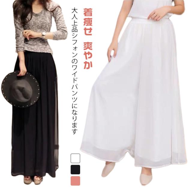 裏地あり ワイドパンツ ロング ズボン ガウチョパンツ シフォン ガウチョ スカート風 着痩せ 爽やか ゆったり カジュアル 夏 レディース 脚長 体型カバー ワイドパンツ ボトムス おしゃれ カジュアル きれいめ