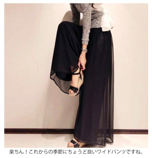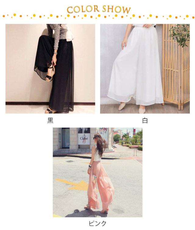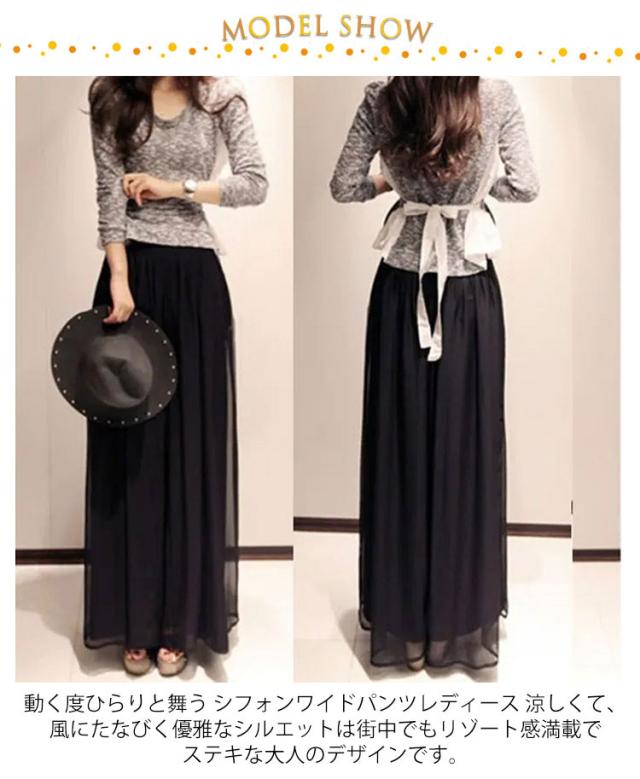 | 大人上品シフォンのワイドパンツになります 動く度ひらりと舞う シフォンワイドパンツレディース 涼しくて、風にたなびく優雅なシルエットは街中でもリゾート感満載でステキな大人のデザインです。 楽ちん!これからの季節にちょうど良いワイドパンツですね。 ウエスト総ゴム仕様で楽なはき心地ながらも、きれい目な見た目が魅力。ゆったりスカート風デザインは着痩せ効果バツグン。 | |
