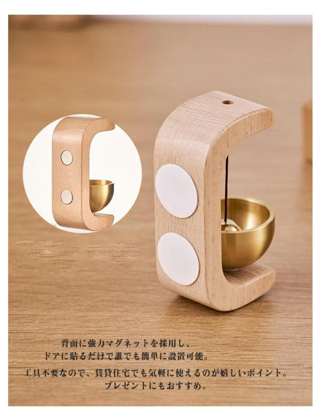 | 工具不要!マグネット式で簡単取り付け 背面に強力マグネットを採用し、ドアに貼るだけで誰でも簡単に設置可能。 木の温もり×可愛い鈴の音色に癒される◎かわいい見た目で気分もUP♪ 木製のナチュラルな素材感と、優しく響く鈴の音が心地よく、毎日の出入りを彩ります。 ドアの開閉に合わせて「チリン♪」と可愛らしく鳴り、来客やペットの出入りにも気付きやすい ナチュラル・北欧・和風など、様々なインテリアスタイルと調和する優しいデザイン。 賃貸でも安心!穴あけ不要で壁を傷つけない 工具不要なので、賃貸住宅でも気軽に使えるのが嬉しいポイント。プレゼントにもおすすめ。 | |