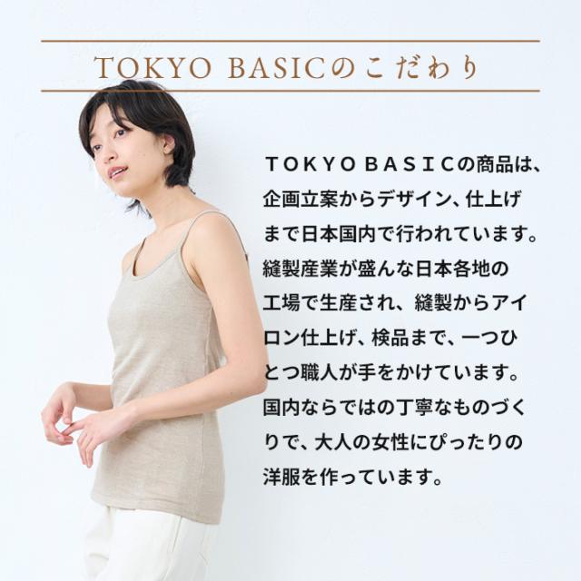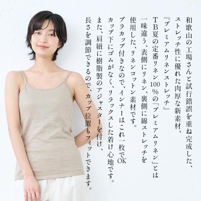 特徴 ストレッチリネンでさらさら快適。「プレミアムリネン」シリーズに肉厚でストレッチ性の高い、新素材登場。身体にフィットするさらさら快適リネンの肩紐調整もできる優秀インナー。和歌山の工場さんと試行錯誤を重ね完成した、ストレッチ性に優れた肉厚な新素材、『プレミアムリネンストレッチ』TB夏の定番リネン100%の「プレミアムリネン」とは一味違う、表側にリネン、裏側に綿ストレッチを使用した、リネンコットン素材です。ブラカップ付きなので、インナーはこれ一枚でカップ下にゴムがなく、リラックスした着け心地です。また、肩紐に樹脂製のアジャスターを付け、長さを調節できるので、カップ位置もフィットできます。