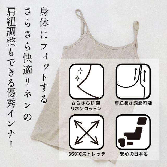 キャミソール カップ付き インナー アンダーゴムなし リネン プレミアムリネン ストレッチ カップ付きキャミソール 日本製 40代 50代 60代 リネンコットン 麻 綿 パッド付 吸湿 速乾 抗菌 下着 通気性 ブラトップ ブラキャミ 締め付けない 吸汗速乾 肌着 カップ付きキャミソール 肩紐 長さ調節可能 肩紐調節 ゴムなし リネン コットン 伸びる 伸縮性 麻 オールシーズン 大きいサイズ LL 生成 ナチュラル