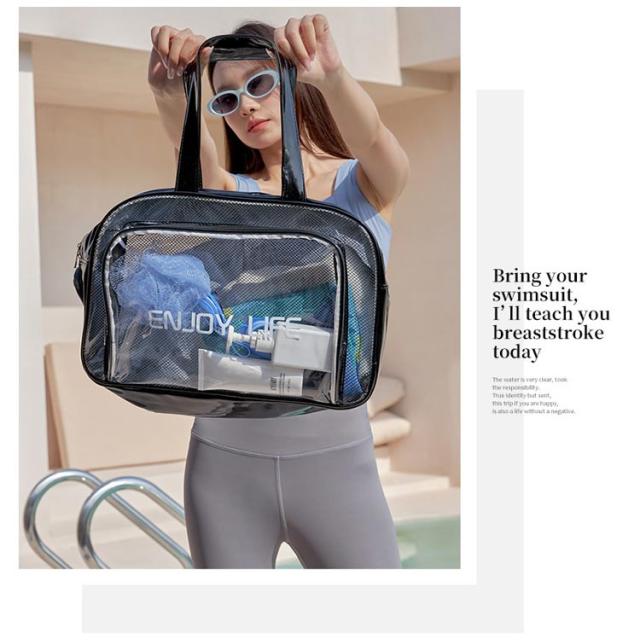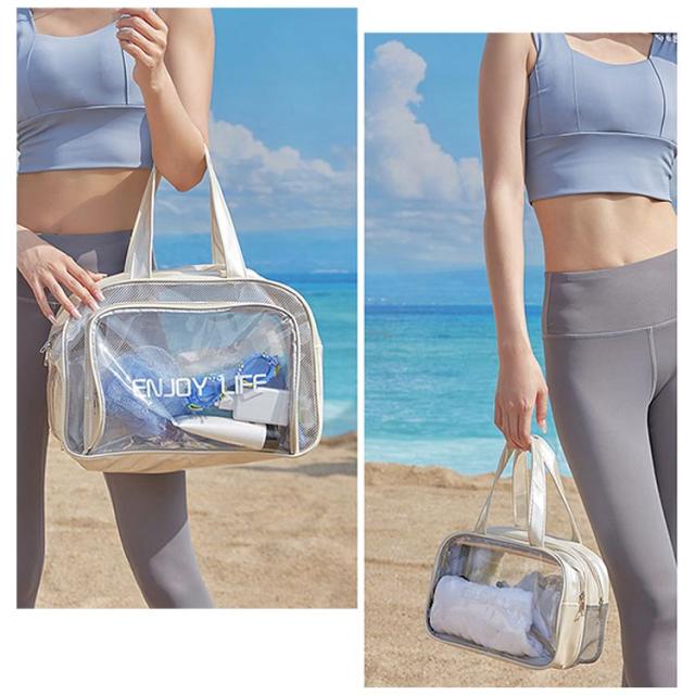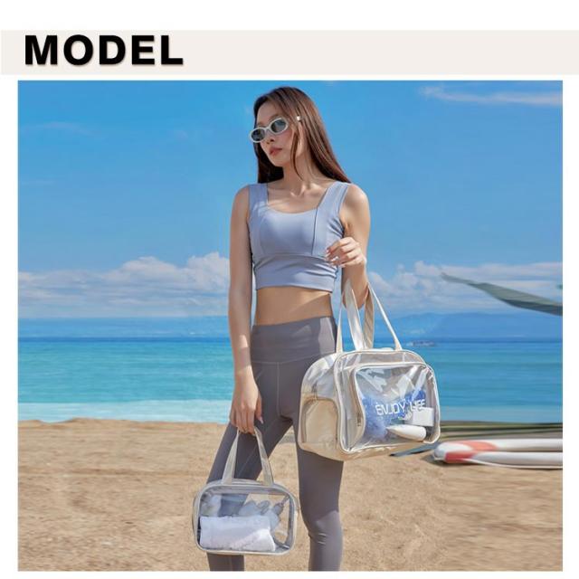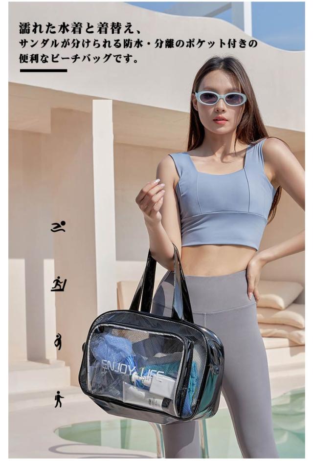 | 透明感のあるクリア素材がトレンド感満載のクリアトートバッグ。濡れた水着と着替え、サンダルが分けられる防水・分離のポケット付きの便利なビーチバッグです。 プールや海水浴で大活躍してくれること間違いなしのバッグです。 たっぷりのマチと大きめのサイズ感がとっても使いやすい! 強靭・軽量を両立。また、撥水性も持ち合わせています。 普段使いから海やプール、温泉、釣り、ジム、サウナ、スポーツまで幅広くご使用いただけます。 | |