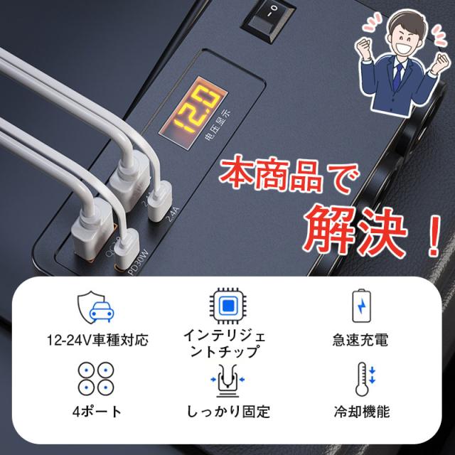 シガーソケット 増設 4連 カーチャージャー 充電 QC3.0 PD30W 固定用テープ付き 12V/24V 急速充電 拡張USB スマートフォン