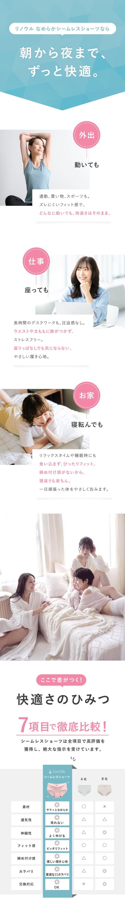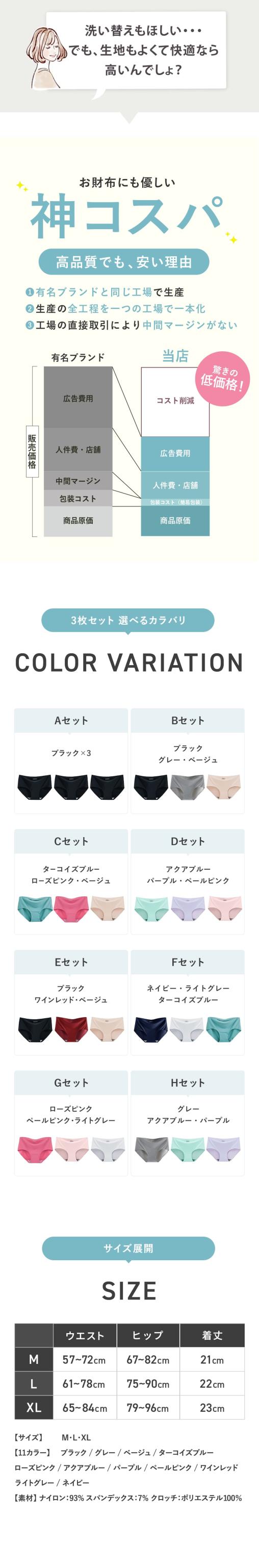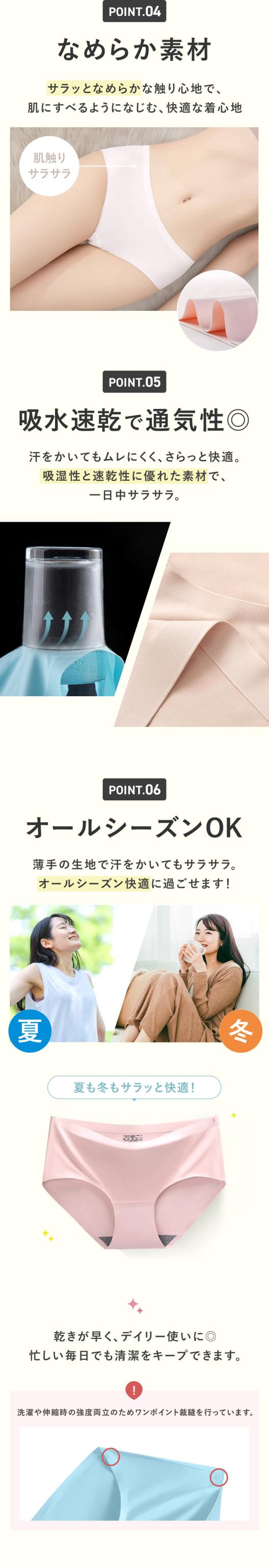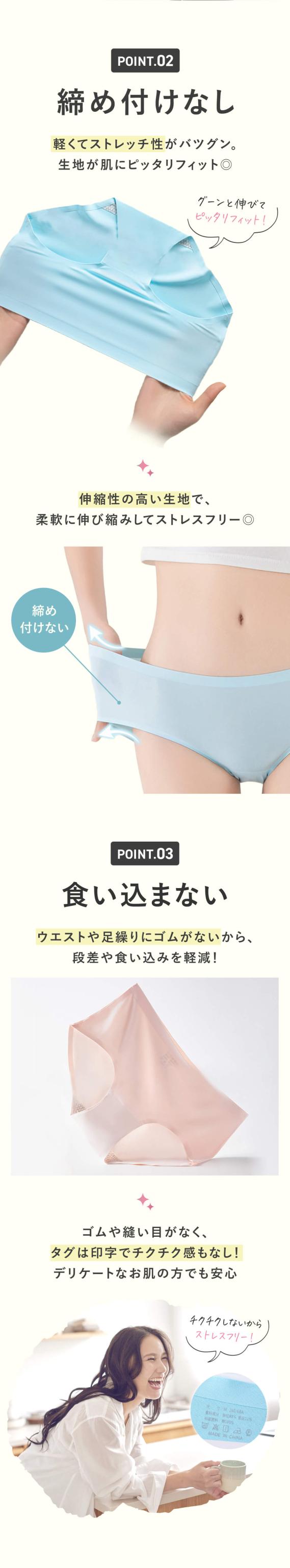 伸縮性の高い柔らかな生地がやさしくフィットし ウエストや足繰り部分にゴムを使用していないため 食い込みや締め付けによる不快感を解消しました タグは印字なのでチクチクせず 素肌のような快適な履き心地です