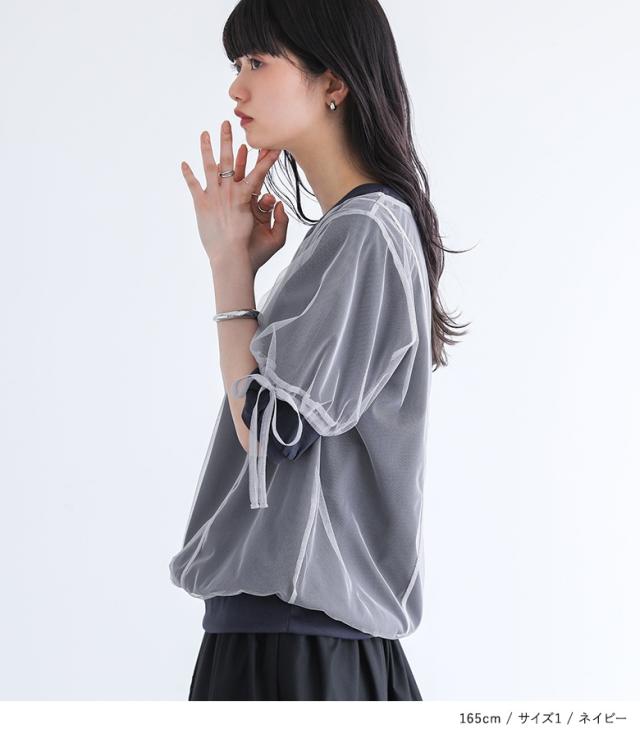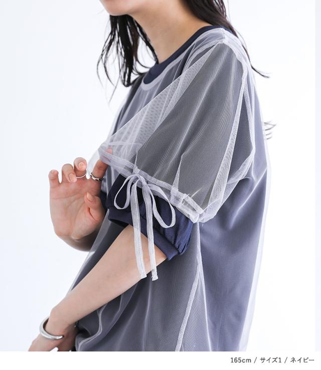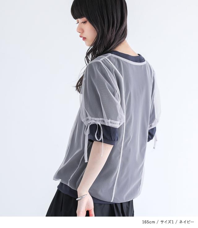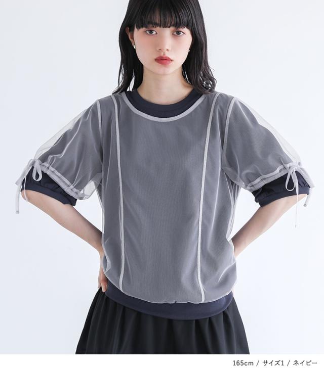 『チュールレイヤードカットソー』※メール便可※【10】[カットソー レディース トップス 半袖 Tシャツ チュール レイヤード 重ね着 ドロスト リボン ドッキング シアー 春 夏]