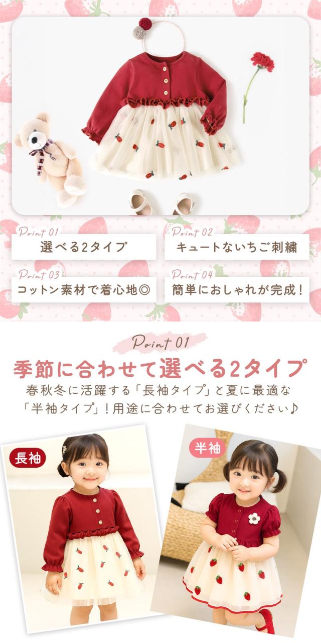【MILASIC公式】キッズいちごワンピース 女の子 ガール 子供 イチゴ柄 刺繍 かわいい おしゃれ キュート 80 90 100 選べる2タイプ 半袖 長袖 コットン コーディネイト SNS映え イベントお出掛け 春秋冬 夏 ドレス ガーリー 記念撮影 誕生日 プレゼント 幼稚園 入園 発表会