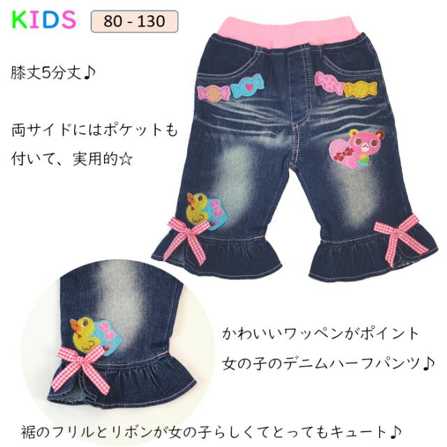 かわいいワッペンがポイントの、女の子のデニムハーフパンツ♪