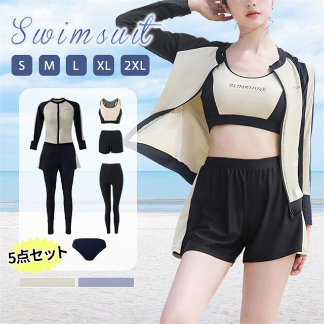 5点セット:ブラ+ショーツ+ラッシュガード+ショートパンツ+レンギス