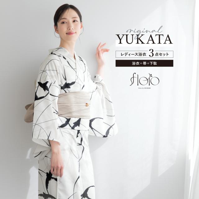 浴衣 セット レディース 浴衣セット 兵児帯 2025 floro 簡単 涼しい 白 黒 ベージュ モノトーン レトロ おしゃれ 大人 アラサー アラフォー ママ 下駄 S フリー 送料無料