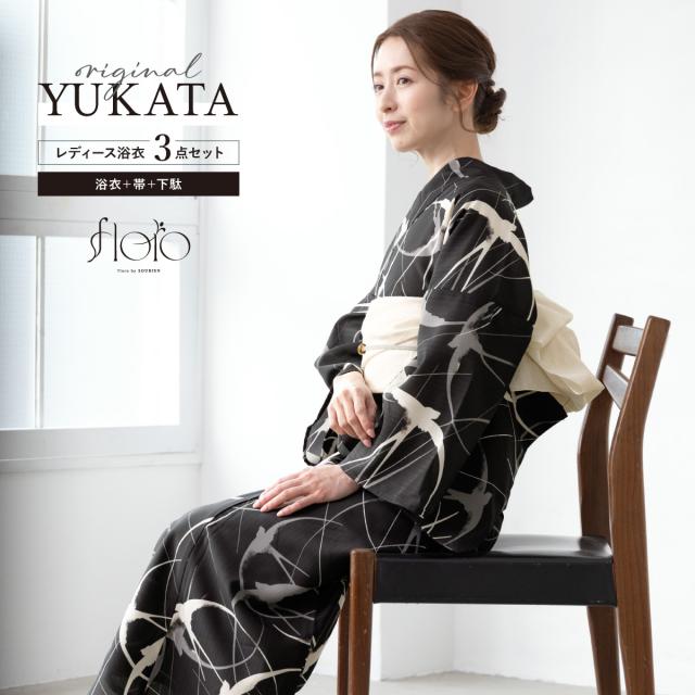 浴衣 セット レディース 浴衣セット 兵児帯 2025 floro 簡単 涼しい 黒 白 燕 モノトーン レトロ おしゃれ 大人 アラサー アラフォー ママ 下駄 S フリー 送料無料