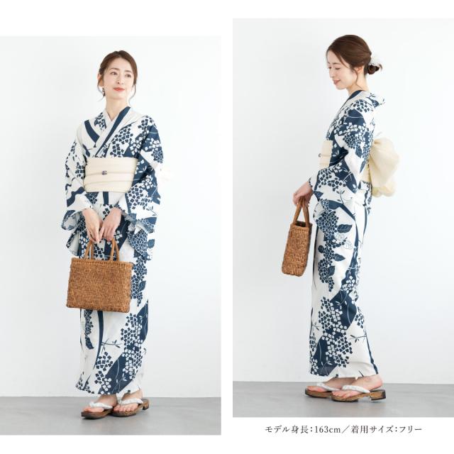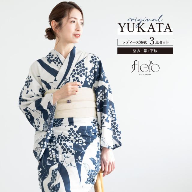 浴衣 セット レディース 浴衣セット 兵児帯 2025 floro 簡単 涼しい 白 紺 紫陽花 レトロ 花柄 おしゃれ 大人 アラサー アラフォー ママ 下駄 S フリー 送料無料