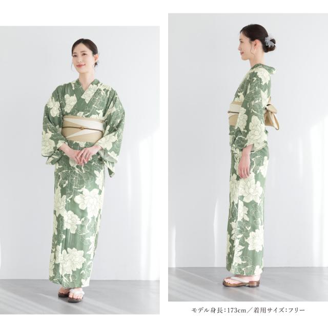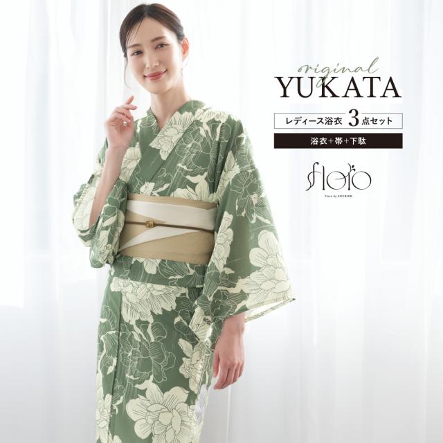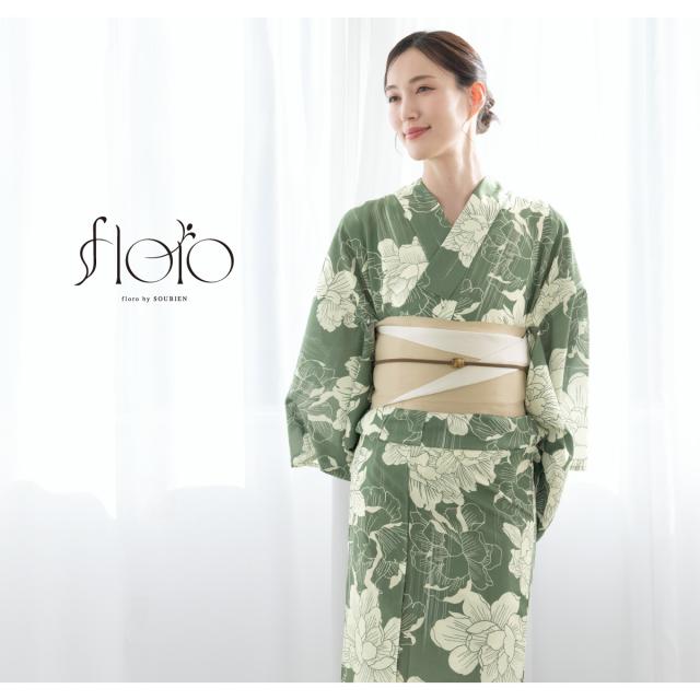 浴衣 セット レディース 浴衣セット 半幅帯 2025 floro 簡単 涼しい 緑 薄ベージュ クリーム 花柄 おしゃれ 大人 アラサー アラフォー ママ 下駄 S フリー 送料無料