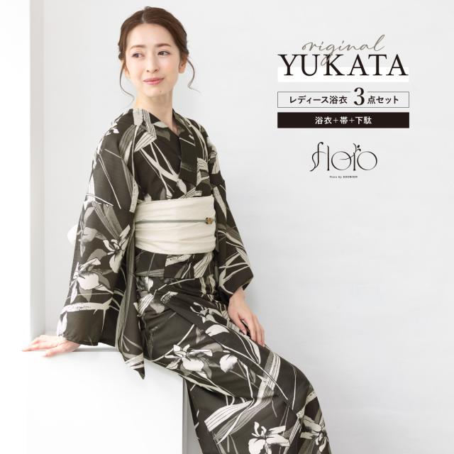 浴衣 セット レディース 浴衣セット 兵児帯 2025 floro 簡単 涼しい 焦茶 白 桔梗 おしゃれ 花柄 レトロモダン 大人 アラサー アラフォー ママ 下駄 S フリー 送料無料