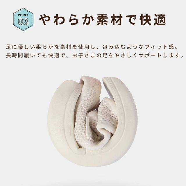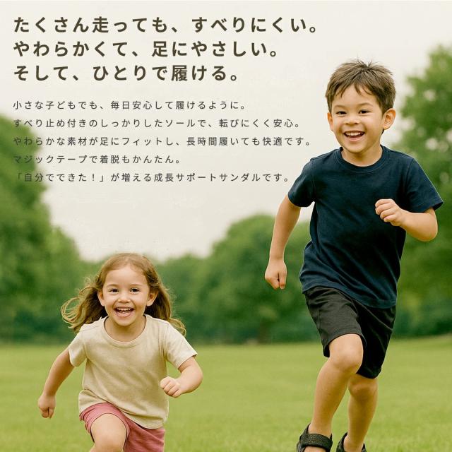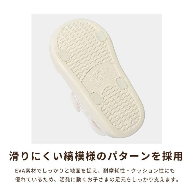 滑り止め付きのソールとマジックテープ付きの着脱しやすい仕様で、元気な子どもたちの足元をしっかりサポートします。