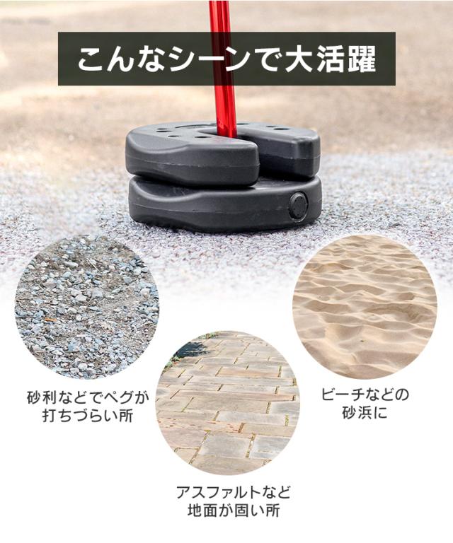 砂浜やコンクリートなどのペグが打てない場所でも安心してテントを固定できます。