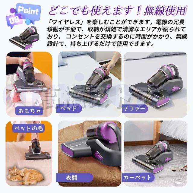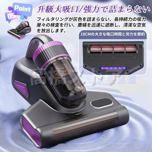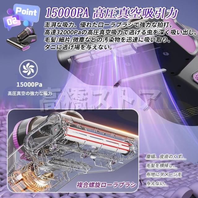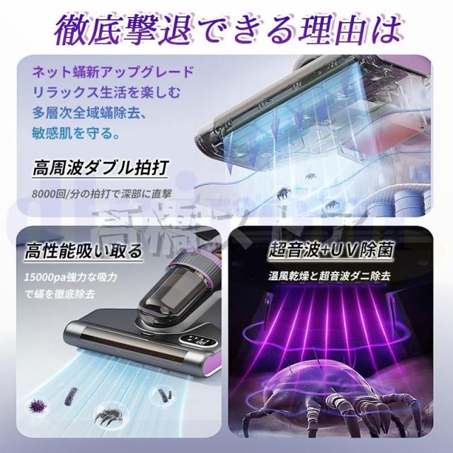超高速振動で強くたたく。ダストなどを除去 15kPa強化した吸引力、より早くダニを捕らえる UV-C紫外線ランプがとうされ、しっかり殺菌を行う