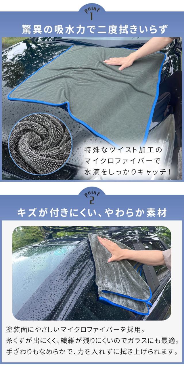 高密度マイクロファイバーが水分を素早く吸収し、二度拭きの手間を削減。洗車の時短に貢献します。