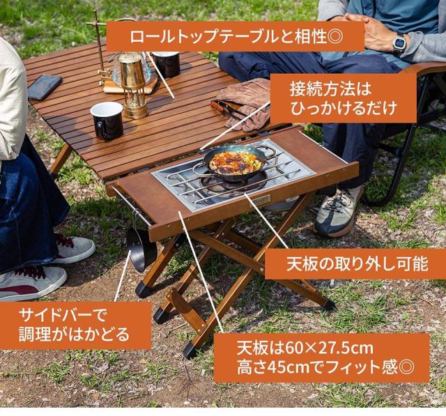 コンロをインストールしたスタイルにしたい。もう少しテーブルを大きくしたい。小さなお子様から火元を離れたところに置きたい…。そんなお悩みを解決できるのが「ジョイントサイドテーブル2」。ウッドロールトップテーブルに引っ掛けるだけで、簡単に卓上スペースと機能の拡張が可能です。