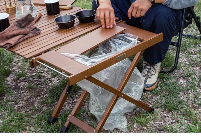 天板は取り外し可能。調理用テーブルとしての利用はもちろん、テーブル内外にあるフレームにシェラカップなどの小物を引っかけることも可能です。内側フレームにごみ袋をひっかけて天板で蓋をすれば、簡易的なごみ箱としてもお使いいただけます。