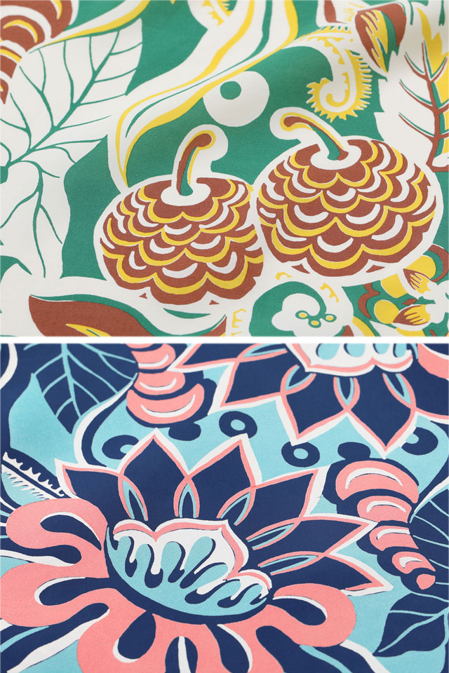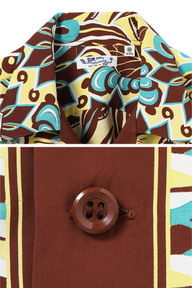 アロハシャツの黄金時代とされる1930〜50年代にかけて作られた「ヴィンテージ」と呼ばれる貴重なアロハシャツを再現し、現代に蘇らせているブランド「SUN SURF」から、レーヨンアロハシャツ「FLOWER FIELD BORDER」(SS39430)のご紹介です。 抽象的に描かれた南国の草花が強烈なインパクトを放つ一枚。 植物のモチーフで構成されたデザインで、前身頃にボーダー・パターンができるようにモチーフがレイアウトされています。 また、生地全体の中央部分はオールオーバー・パターンでデザインされ、後身頃の部分に使われています。 生地の両端の部分には無地場を作り、前立て部分や襟、袖口などに使用。 箇所によって柄と無地場がアクセントになるように計算し、プリントされた非常に興味深い一枚です。 ボディーには、てろんとしたフィラメントレーヨン生地を採用しました。 | ||||||||||||||||||||||||||||||
