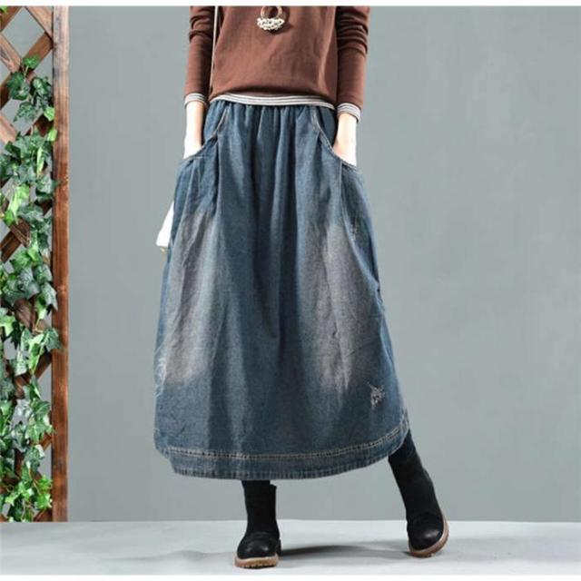 デニムスカート レディース ロング丈 ランタンスカート ミモレ丈 ユーズド加工 無地 バルーン 美脚 ウェストゴム カジュアル おしゃれ 体型カバー 秋冬 30代