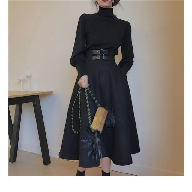 セットアップ 2点セット レディース パフスリーブ OL 秋冬 オシャレ タートル Aライン スカート 新作 着痩せ カジュアルセット きれいめ ブラック 30代 40代