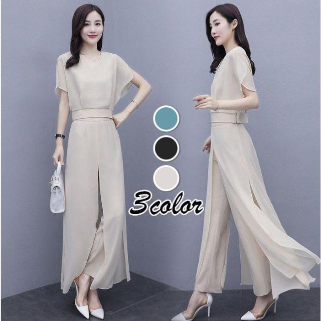 セットアップ レディース 40代 春夏 オシャレセットアップ 半袖ブラウス ワイドパンツ シフォン上下セット 韓国風セットアップ 通勤 30代 50代 大きいサイズ