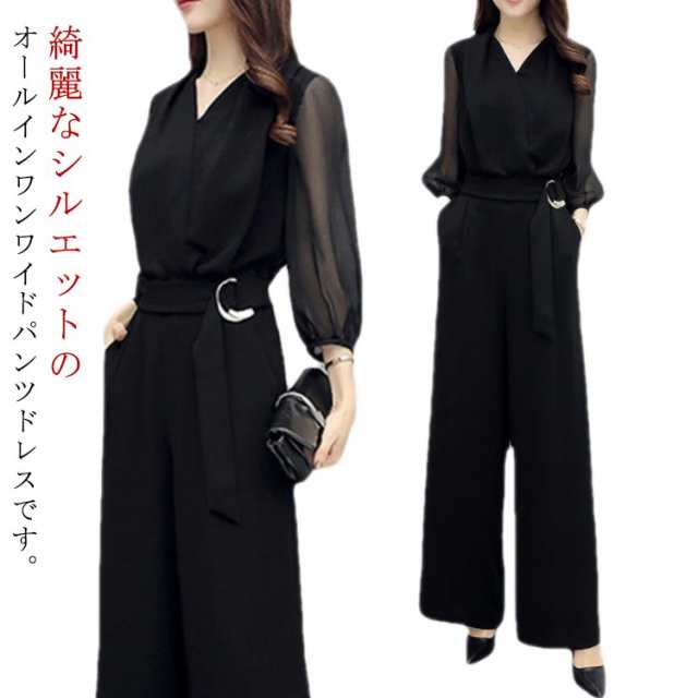 パンツドレス オケージョン ウエストゴム 入学式 セレモニー 二次会 発表会 ドレス お呼ばれ 結婚式 ワイド パンツ お呼ばれ 袖あり パンツスタイル 女子会 体型カバー 七五三 30代 40代 七分袖 20代 ブラック レディース オールインワン