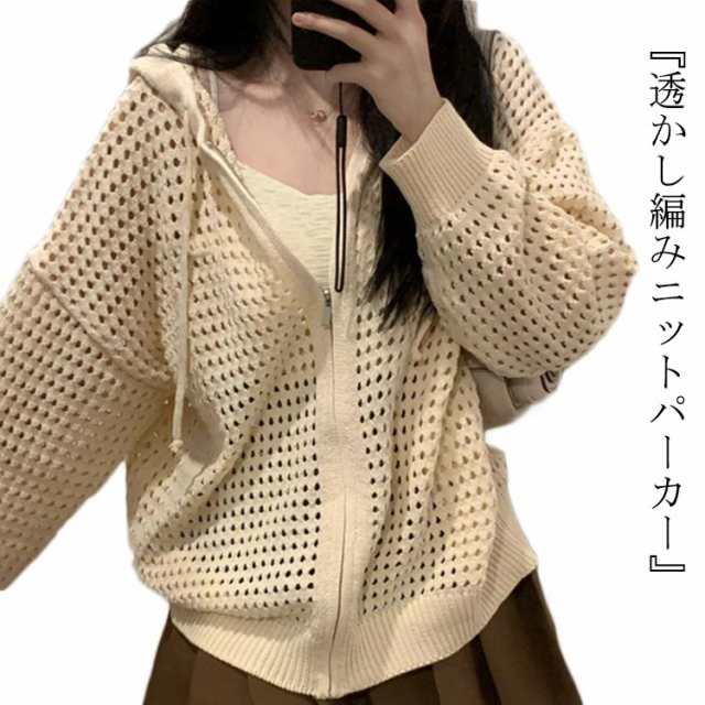 メッシュ編みジップアップパーカー レディース ニットパーカー パーカー ニット トップス 長袖 春秋 重ね着 フード付き 穴あき 肌見せ レイヤード ベージュ 透かし編みニットパーカー