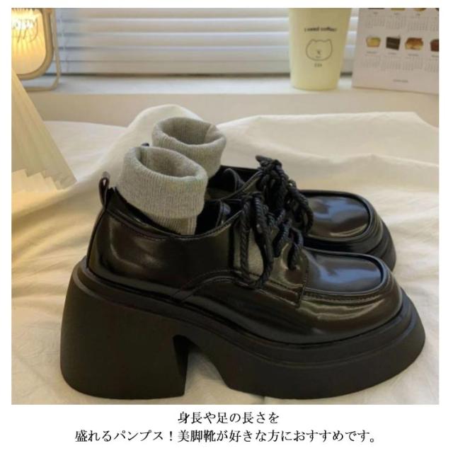 | 安定感があり、長時間履いても疲れにくいおでこパンプス 厚底の相性が良く、色々なコーデになんなく活躍してくれる万能パンプス レースアップ部分で紐を緩めたり締めたりできるのでお好みの具合に調節でき、安定して履いていただけます。 身長や足の長さを盛れるパンプス!美脚靴が好きな方におすすめです。 シンプルなデザインなので、色々なアイテムやコーディネートに合わせやすいアイテムです。 | |