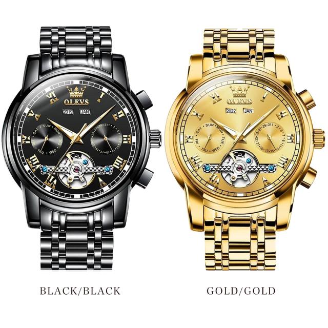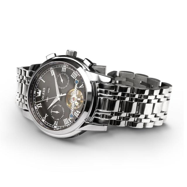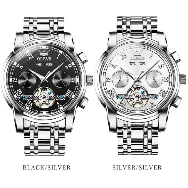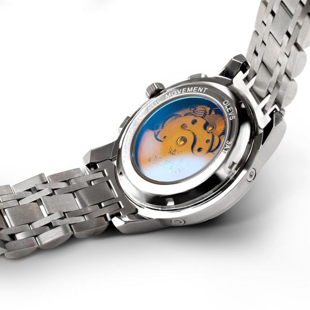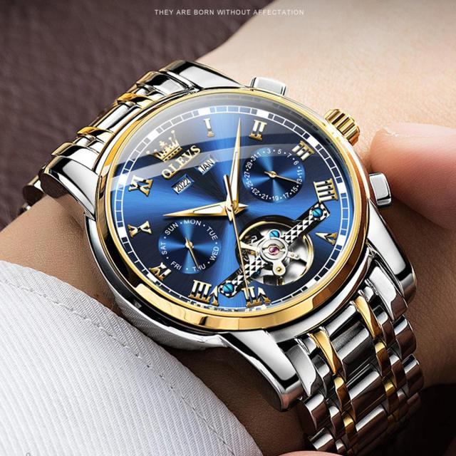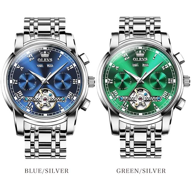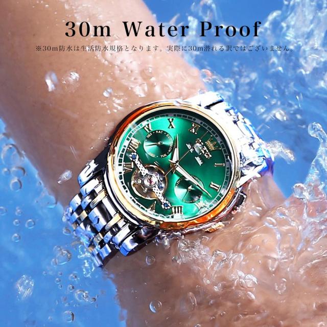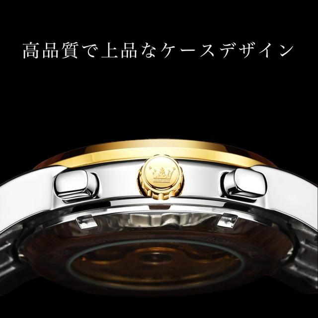 OLEVSの自動巻き腕時計は、月・曜日・日付の多機能インダイヤルを搭載した高級感あふれるクロノグラフモデル。電池不要の自動巻き機構に手巻き機能も備え、使いやすさと信頼性を両立。重厚なステンレスボディにシースルーバックを採用し、ムーブメントの動きを目でも楽しめます。生活防水・夜光機能付きで、ビジネスにもカジュアルにも対応。8色のバリエーションから選べ、プレゼントにも最適なデザイン。