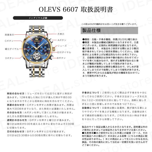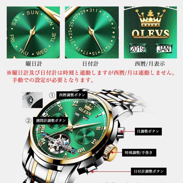 OLEVSから登場した自動巻き式の高級機械式腕時計は、洗練されたデザインと優れた機能性を兼ね備えた一本。 文字盤には腕時計の心臓ともいえるテンプを魅せる躍動感のあるデザインとなっています。 ビジネスからプライベートまで、様々なシーンで活躍するラグジュアリーなタイムピースです。 【自動巻き&手巻き対応】 本モデルは自動巻きムーブメントを採用し、腕の動きによって自動的に巻き上げが可能。またリューズ操作による手巻きもできるため、長時間使用しない場合でも簡単に時間調整できます。 【多機能インダイヤル搭載】 曜日・日付・月表示の3つのインダイヤルを搭載し、視認性と実用性を両立。西暦表示も装備され、日常使いに便利です。 【夜光針&蓄光インデックス】 暗闇でも視認性を確保できる夜光機能付き。昼間に光を蓄え、夜間に美しく発光します。 【30m生活防水】 防水性能は生活防水(3ATM)に対応しており、雨や洗顔時の水しぶき程度であれば問題なく使用可能です。 【デザイン性&高級感】 ステンレススチールのバンドに繊細な仕上げが施され、重厚感と高級感を演出。シースルーバック仕様で裏面からムーブメントの動きも楽しめます。 【選べる8カラー】 シルバー、ブラック、ブルー、グリーン、ゴールドなど8種類の豊富なカラーバリエーション。あなたのスタイルにぴったりの1本が見つかります。 【ギフトにも最適】 誕生日や記念日、バレンタイン、就職祝いなど、大切な人への贈り物としてもおすすめ。。 ※注意事項 ・月と西暦の表示は手動設定となります。 ・30m防水は生活防水規格です。水泳や潜水には使用できません。 ・商品画像はモニター環境により色味が異なる場合があります。 |