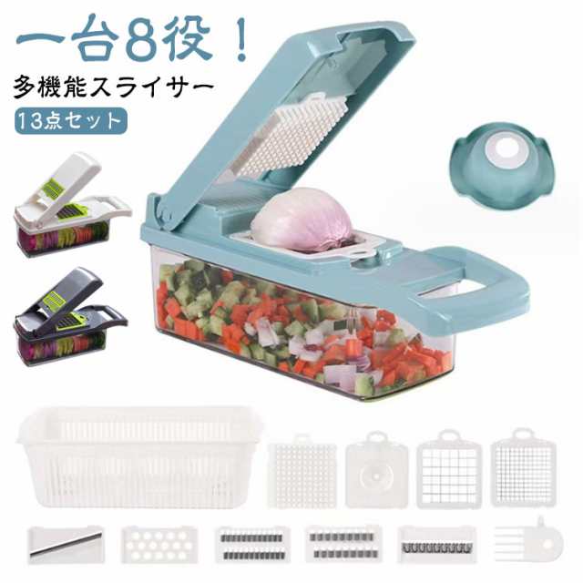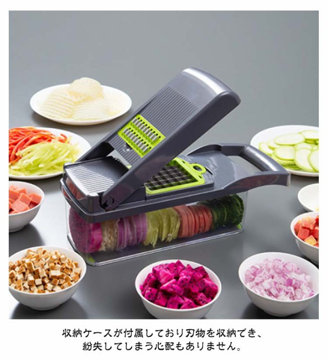 | 【一台8役!】 【多機能スライサー】 【13点セット】 1台で十分!多機能スライサー。 ステンレス製の刃のため靖びにくく耐久性に優れております。 刃は取り外し可能なので刃も本体も手軽に洗浄できます。 収納ケースが付属しており刃物を収納でき、紛失してしまう心配もありません。 ハンドルが付いているので握り心地もよく使いやすいです。 卵白分離器や水切りカゴ、掃除用ブラシなども付属しており、一台だけで十分に満足できる! | |